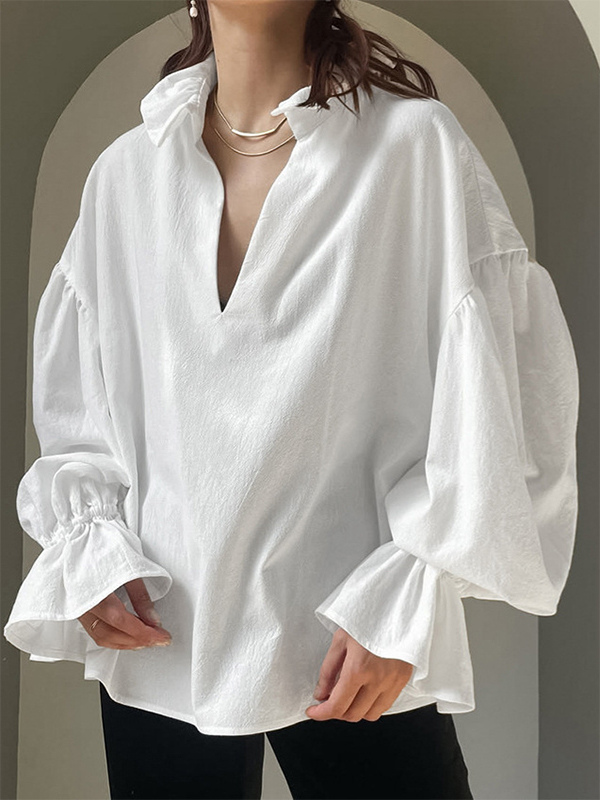 綿100%ブラウス レディース シック ボヘミアン トップス - ホワイト フリルネック ランタンスリーブ Vネック - ビーチバケーション 2026