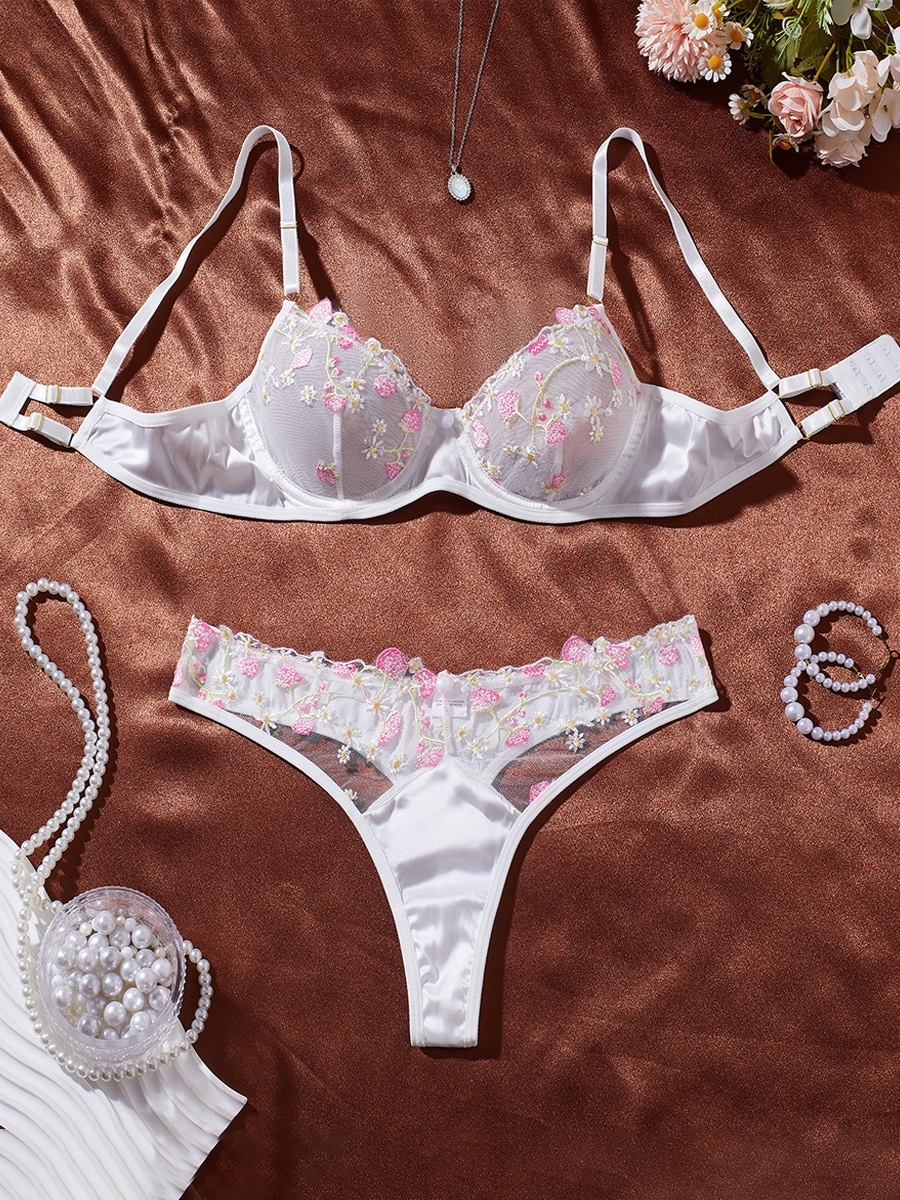 花柄プリントの透け感のある白いブラジャーとショーツのツーピースランジェリーセット