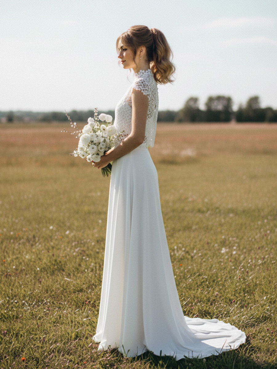 3ピースウェディングドレス レース シフォン イリュージョンネックライン ジッパー ショートスリーブ