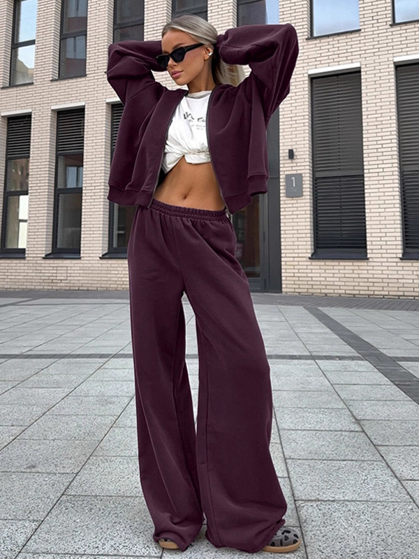 アクティブな女性のためのアスレジャースタイルセット - プラム色のフード付きジップアップワイドレッグトラックスーツ - 2026年春のラウンジヨガウェア
