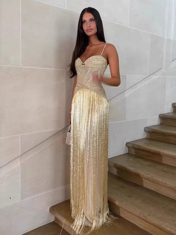 ビーズ装飾フリンジ付きスリップカクテルドレス(女性用) - アプリコットカラーのギャツビー風フラッパースタイルノースリーブマキシガウン - サマーパーティープロム2026