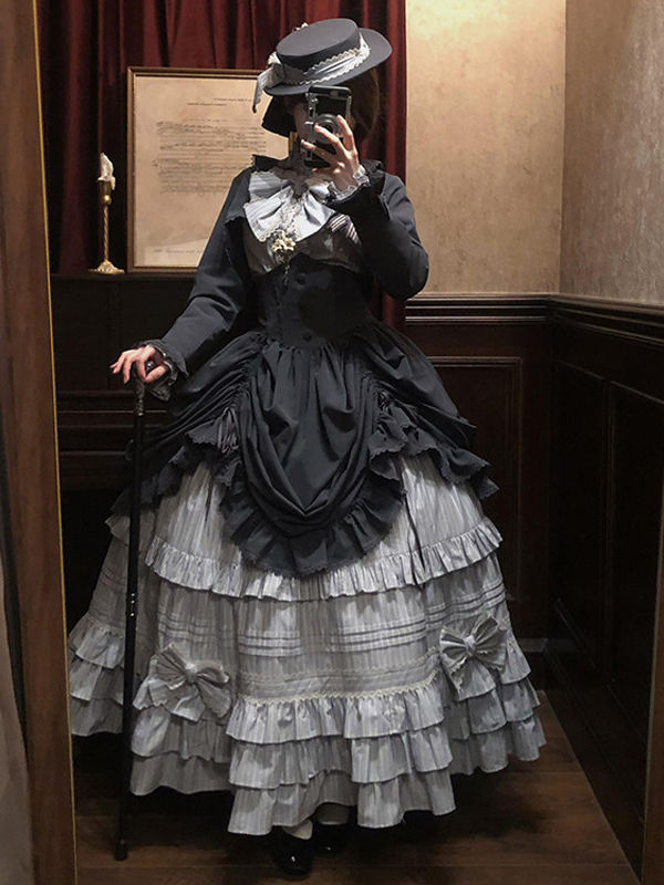 ブラックゴシックロリータドレスセット ヴィンテージスタイル ビクトリアンフリル 長袖シャツ オーバーコート スカートセット
