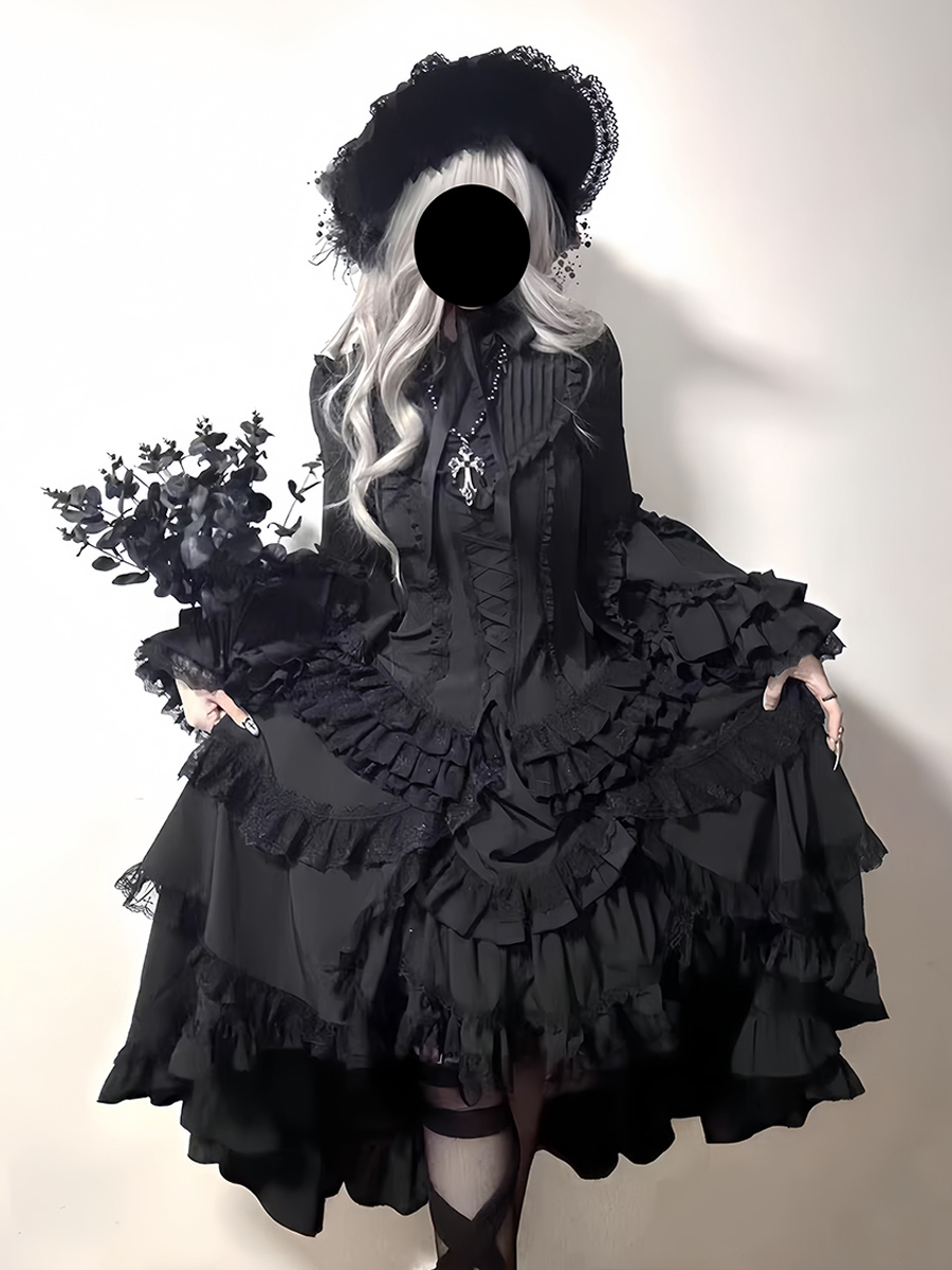 黒のゴシックロリータドレス、フリル付きトランペットスリーブ、長袖フリルロリータドレス