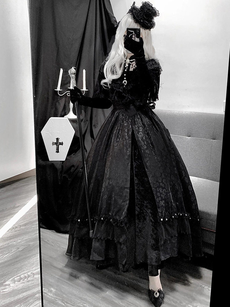 黒ゴシックロリータドレス ヴィンテージレトロロリータファッション レースフリル 長袖ロリータロングドレス