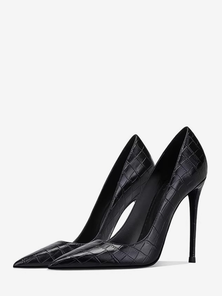 ブラックハイヒールパンプス レディース ポインテッドトゥ ストーン柄 スリッポン ドレスシューズ