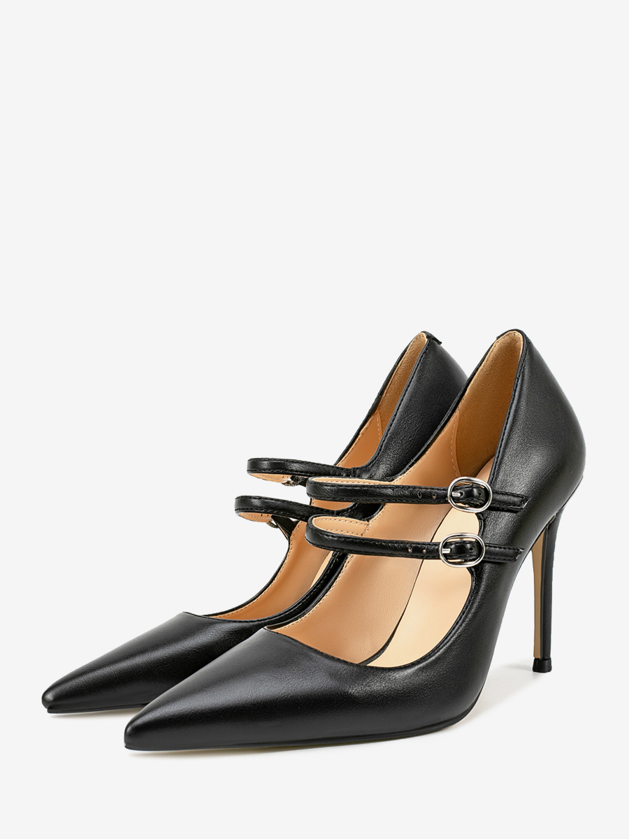 ブラックのメリージェーンシューズ、ポインテッドトゥ、スティレットヒールパンプス