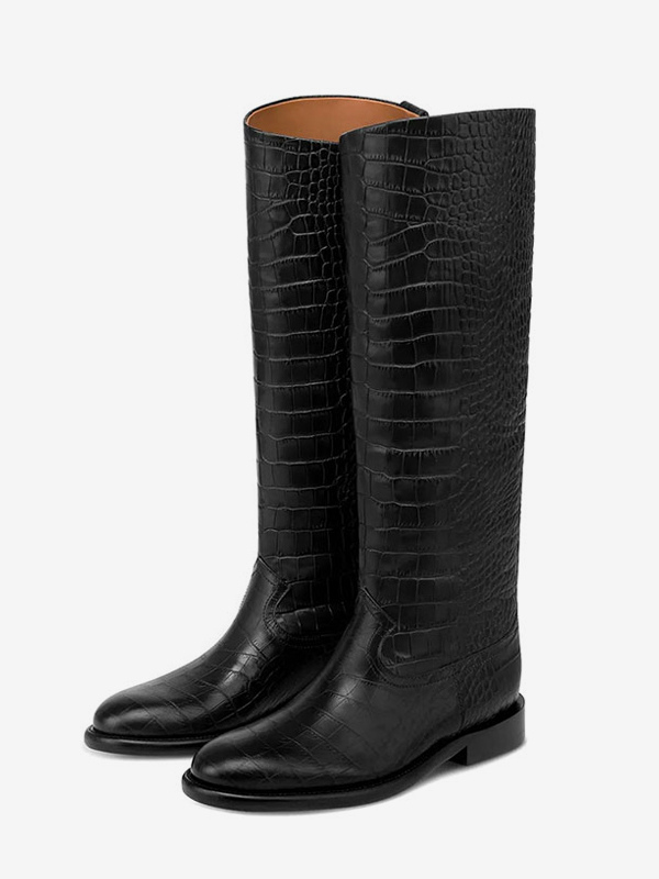ブラック乗馬ブーツ レディース ラウンドトゥ ストーン柄 フラットニーハイブーツ