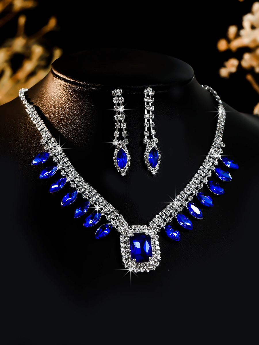 パーティーや舞踏会に最適な、ブルーのレディース用エレガントジュエリーセット、イヤリング、ネックレス、ラインストーンセット