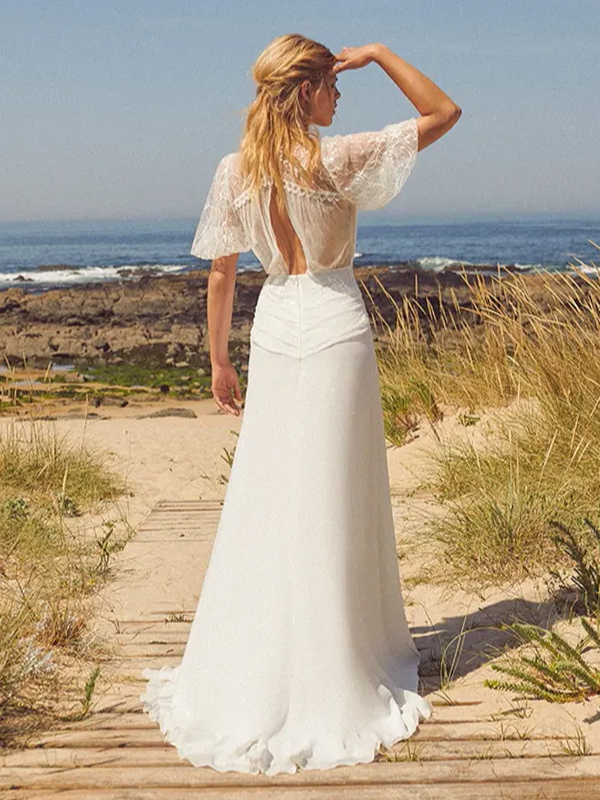 ボヘミアンウェディングドレス シフォン フロントスリット Aライン トレーン付き ナチュラルウエスト ウェディングドレス 機能的なボタン 半袖 Vネック アイボリー