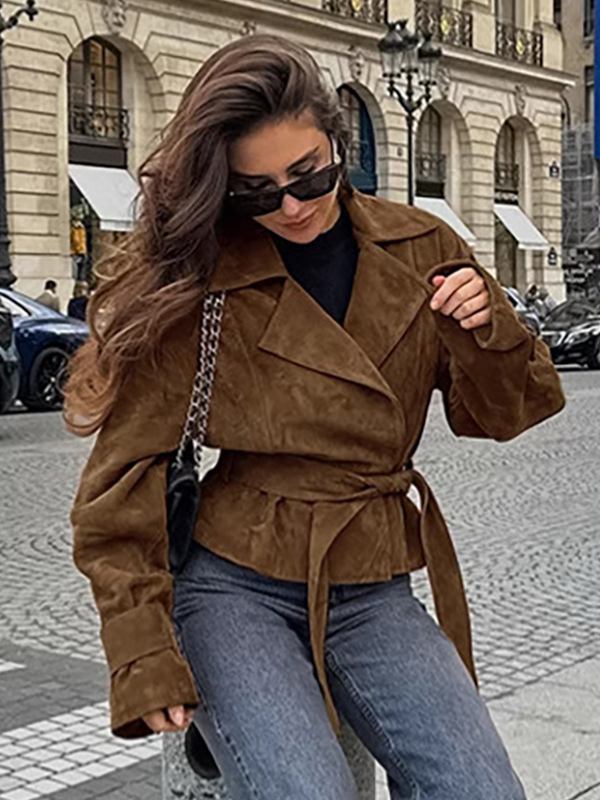 ブラウン スエード レディース クロップド ブレザー - レトロ ラペル ベルト付きウエスト レギュラーフィット ジャケット - ヴィンテージ スプリング デイリー アウトフィット 2026