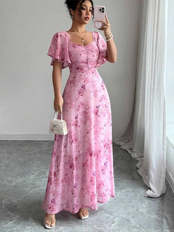 バタフライプリント レディース シフォン マキシドレス - ギャザー入りバスト フリル袖 デートナイトドレス - 夏のガーデンウェディングゲスト 2026