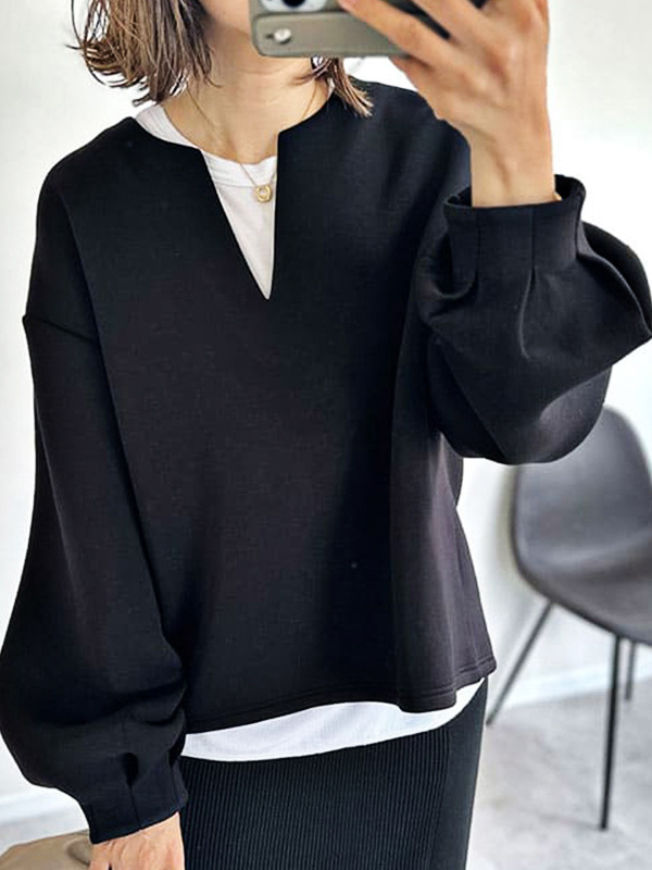 カジュアルデザインのネックラインのランタンスリーブブラックロングスリーブオーバーサイズトップススウェットシャツ/パーカートップスレディースファッション