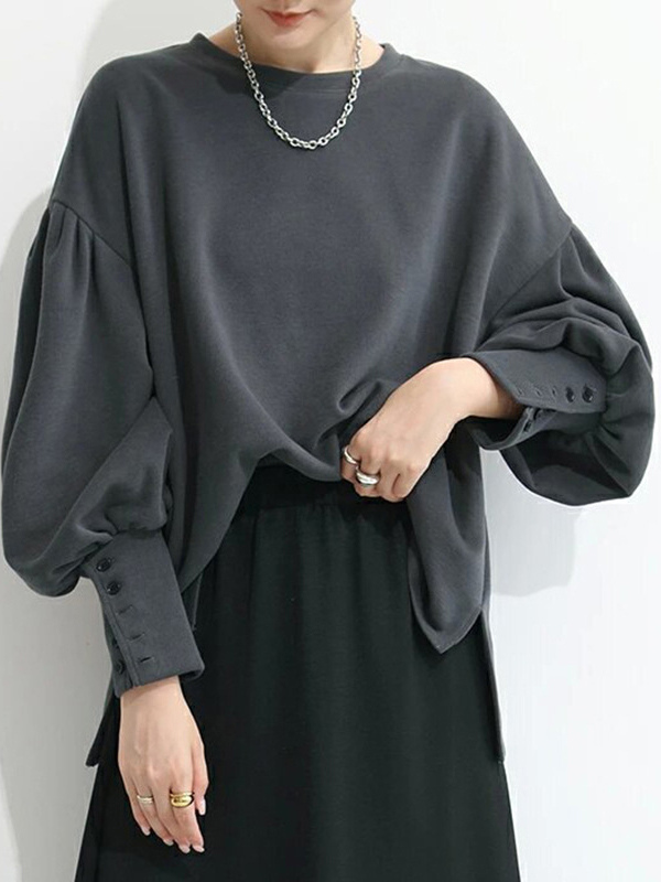 カジュアル ジュエルネック ランタンスリーブ ディープグレー 長袖 プリーツボタン トップス スウェットシャツ/パーカー トップス レディース ファッション