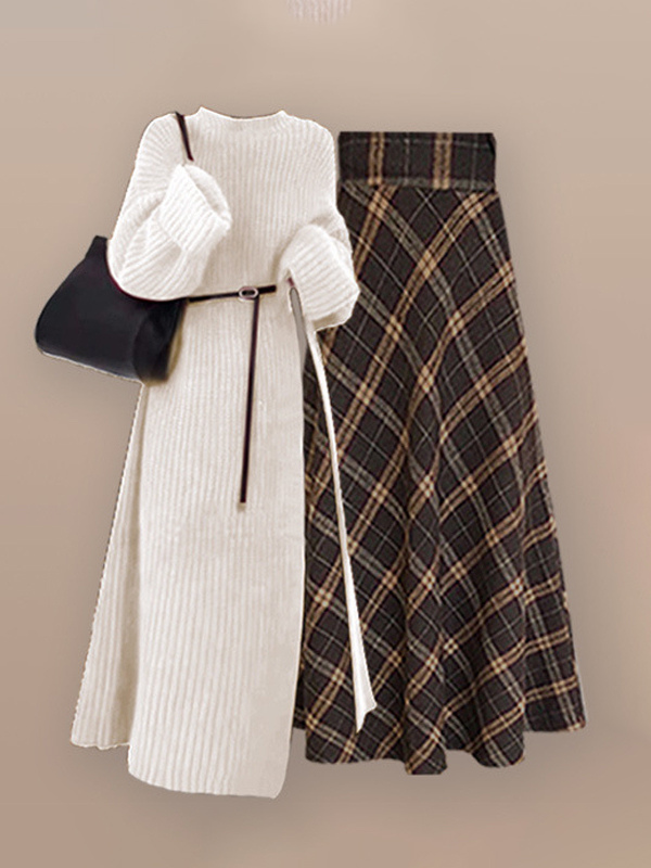 カジュアル セットアップ ラウンドネック 長袖 チェック柄 バックルベルト シンプル レディースファッション