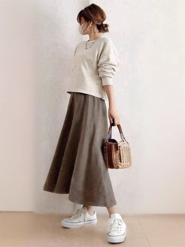 カジュアル セットアップ ラウンドネック グレイ 長袖 スカート バイカラー シンプル レディースファッション
