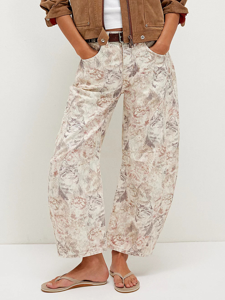 猫柄バレルジーンズ(レディース) - ニュートラルベージュ レトロホースシュー ワイドレッグデニムパンツ - 2026年春のカジュアルストリートウェア