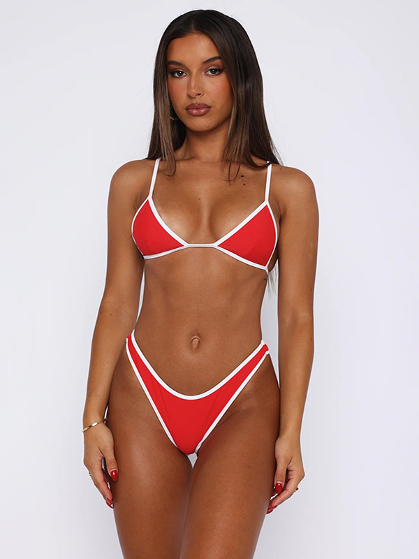 シックなコントラストビキニセット(女性用) - 赤と白のスポーティーなトライアングルトップとハイカットのチーキーボトム - サマープールパーティー2026