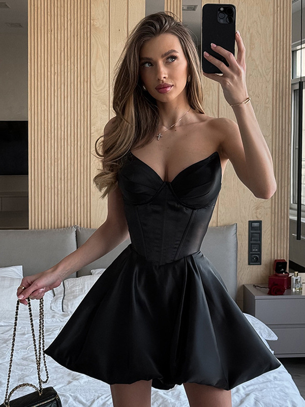 コルセット風コケットサテンドレス(女性用) - ブラックゴシック スウィートハート ボーン入りノースリーブ Aラインドレス - 2026年夏の誕生日パーティー