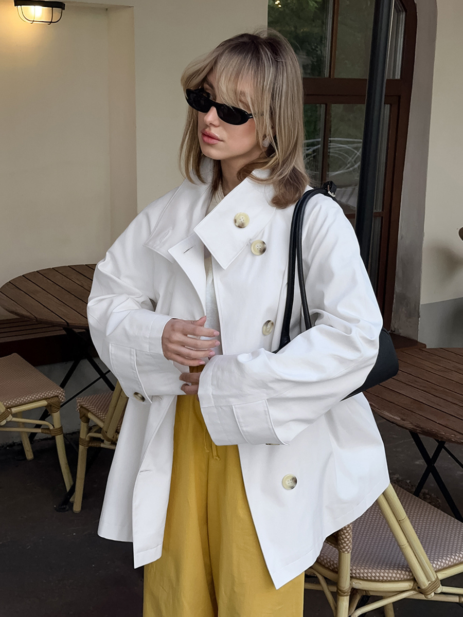 コットン混紡レディーストレンチジャケット - ミニマルなダブルブレスト、ワイドスリーブ、オーバーサイズフィット - 2026年春のカジュアルストリートウェア