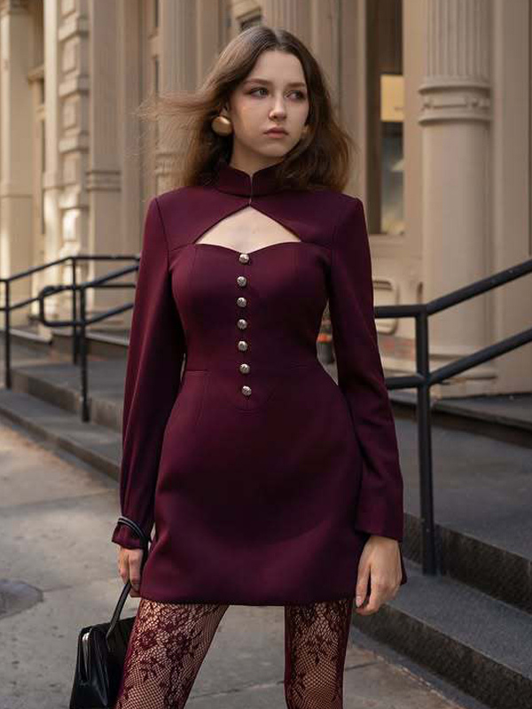 カットアウト長袖ミニドレス(女性用) - モックネックボタンディテールドレス - 春のデートナイトパーティー 2026