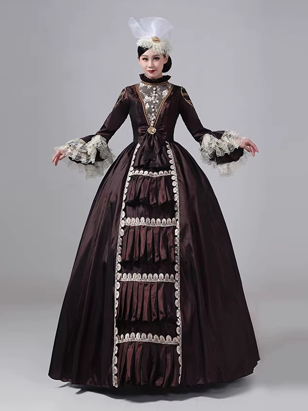 ディープブラウンのビクトリアンドレス、長袖、レース、ハイカラー、ボールレトロドレス
