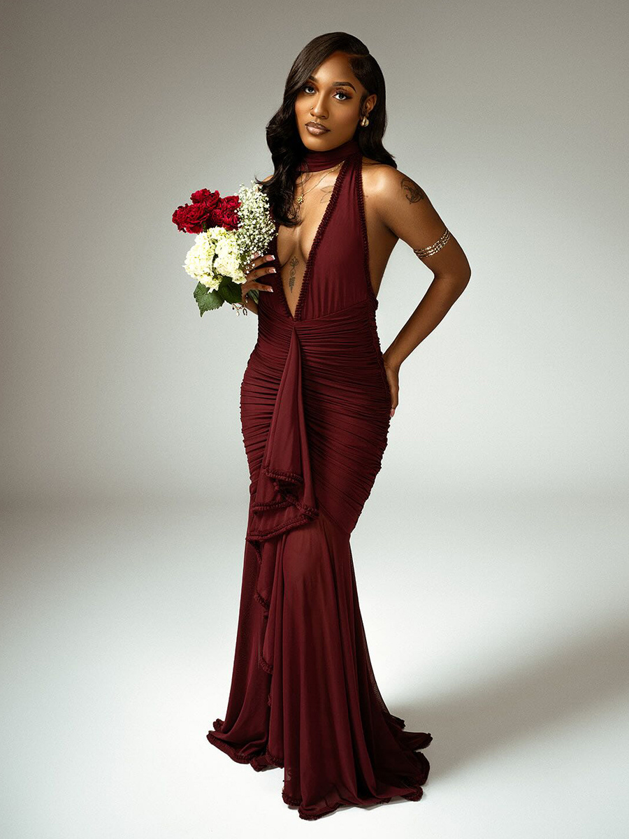 ディープVネックホルターネックルーシュボディコンマキシパーティードレス(レディース)2026