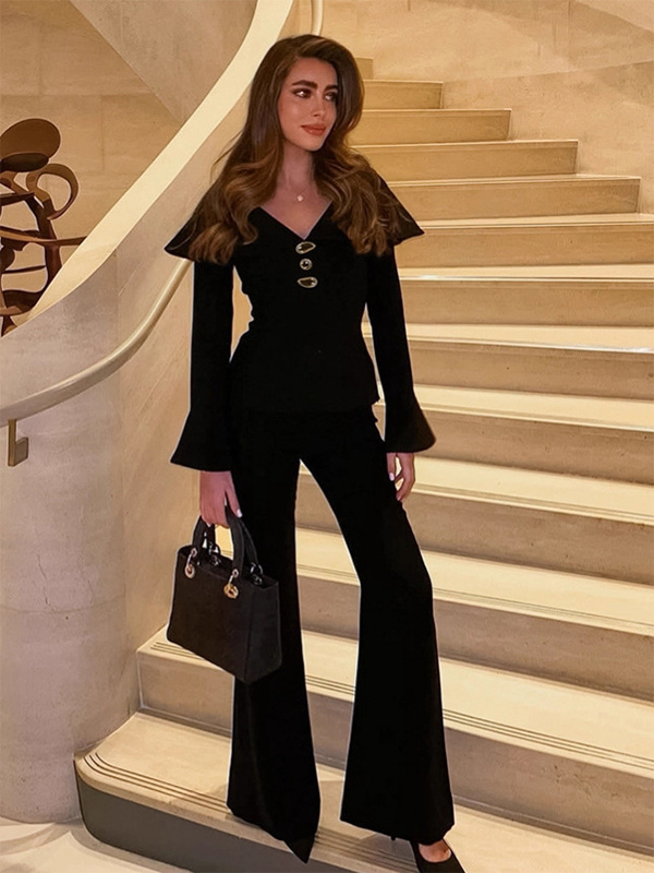 エレガントなツーピースセット レディース トラウザースーツ - ヴィンテージ風の大きな襟、ゴールドボタン、ベルスリーブ - 2026年春のガラ・イブニング衣装