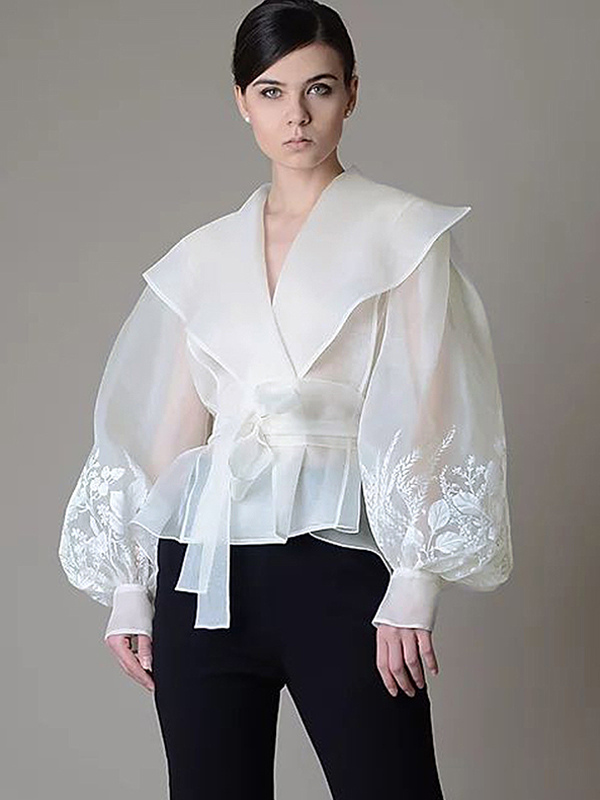 刺繍入りオーガンザブラウス パフスリーブトップス レディース - アプリコット ボヘミアン風タイウエスト シアーラップシャツ - サマーガーデンパーティー 2026