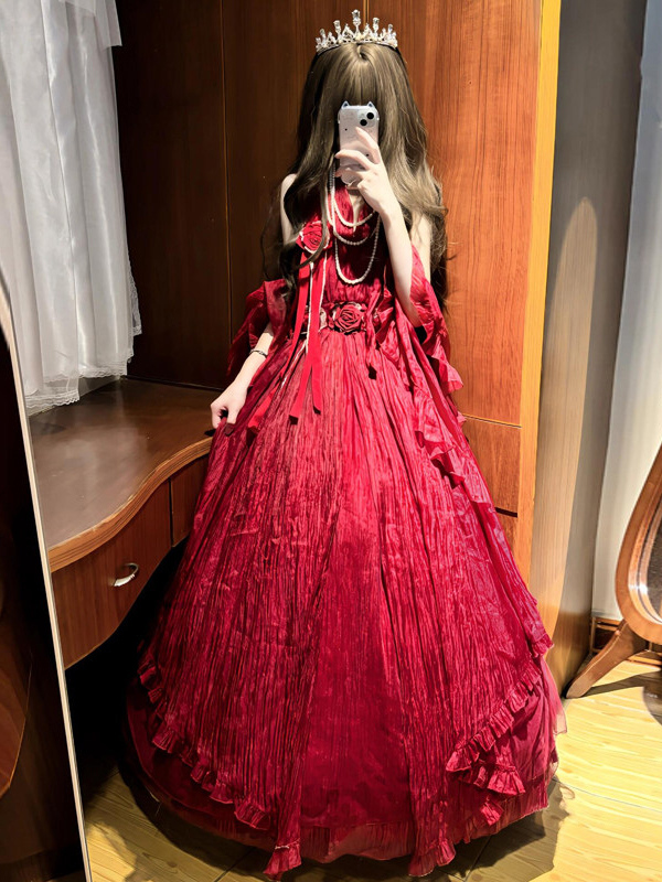 フェアリーロリータドレス ダークレッド ホルターサッシュ ティーパーティーロリータプロムドレス