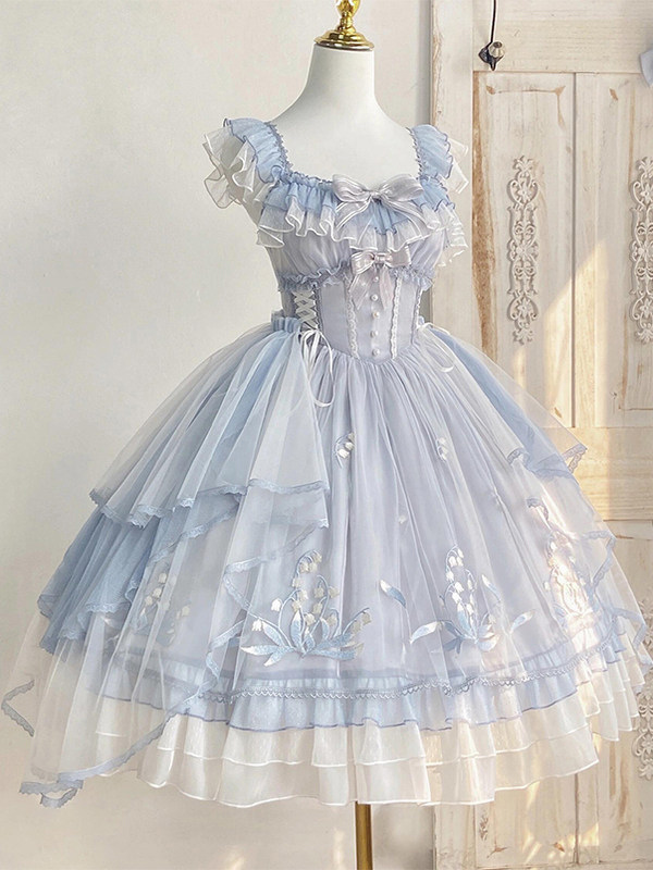 スイートロリータJSKドレスライトスカイブルーフリルリボン刺繍袖付きロリータドレス