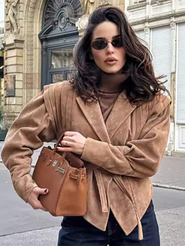 レディース用フェイクスエードラップジャケット - ブラウン砂時計型テーラードブレザー構造ショルダーコート - 2026年春のシックなストリートウェア