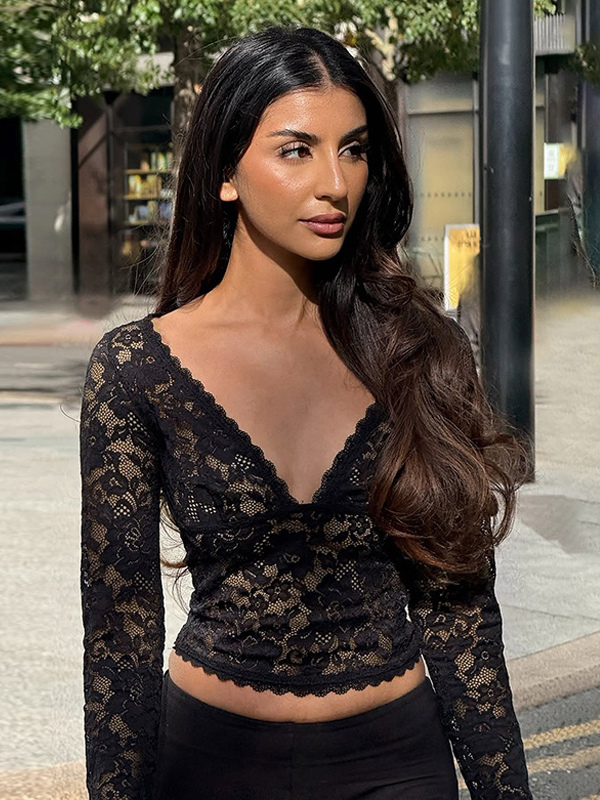 花柄レースのクロップトップ(レディース) - ブラック セクシー Vネック 長袖 - 春のナイトアウト クラブウェア 2026