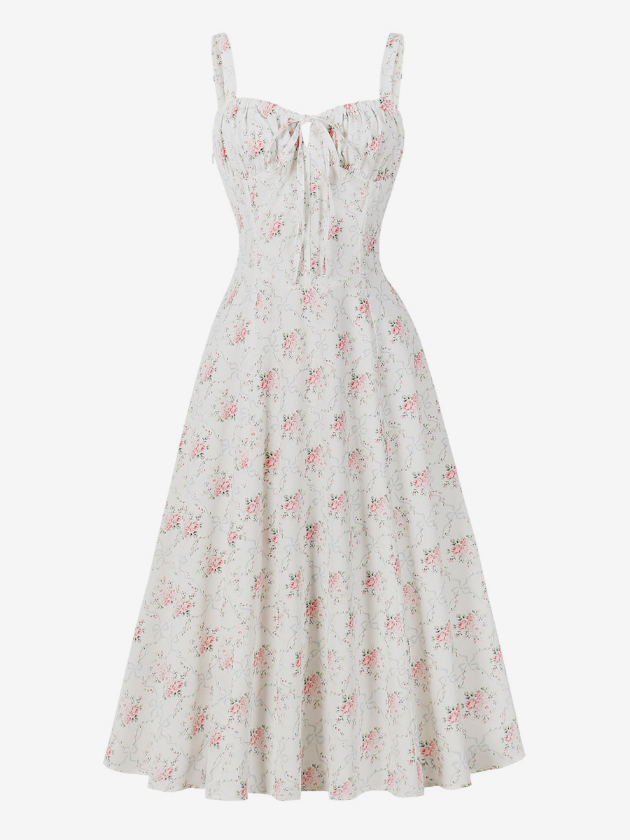 フローラルプリント ルーシュバスト ノースリーブ Aライン ミディ丈 ティードレス レディース 2026