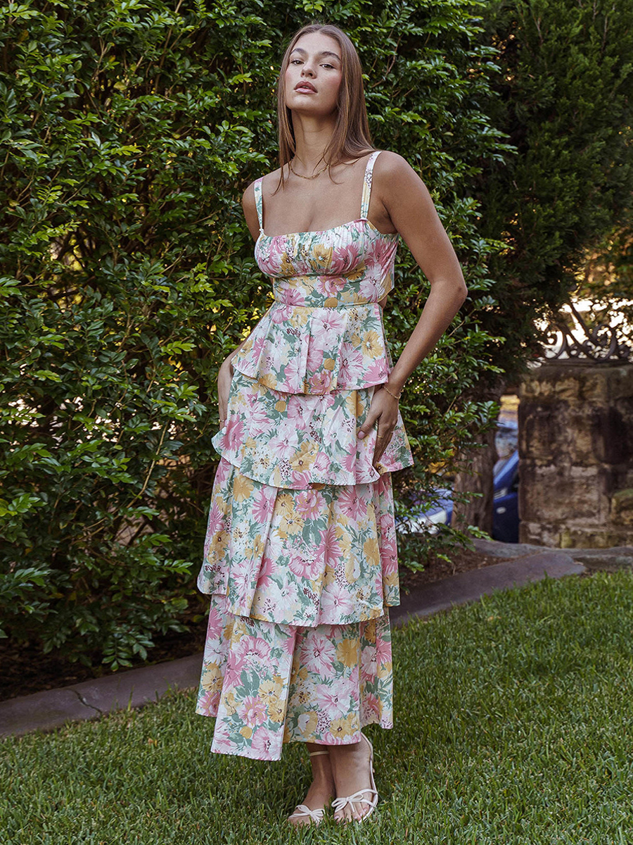 花柄プリントのフリル付きマキシ丈スリップドレス(女性用) - ボヘミアン風ティアードAラインストラップ付きサマードレス - 2026年夏のビーチバケーション