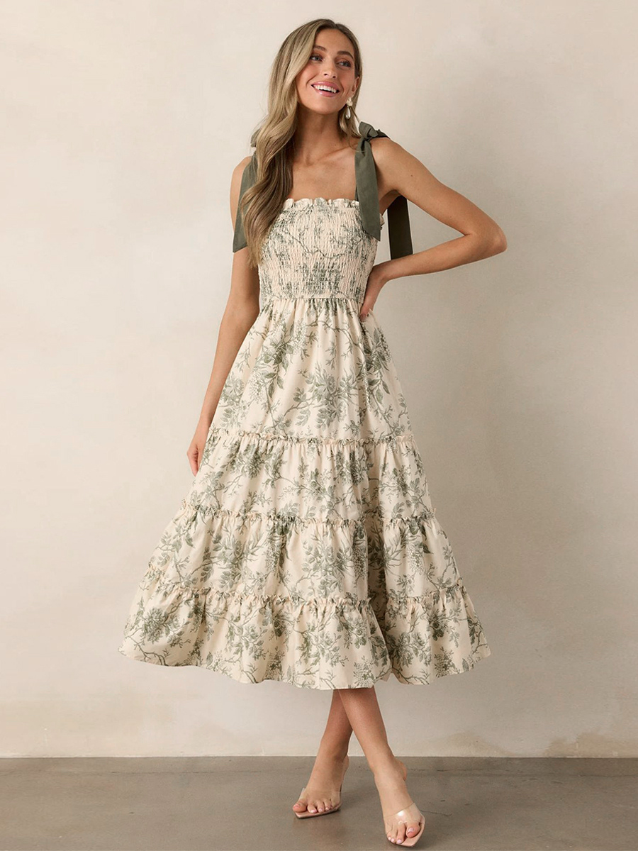 花柄スモックミディドレス(女性用) - セージグリーン ボヘミアン風タイショルダー ティアードフリル Aラインサマードレス - 2026年夏ビーチバケーション