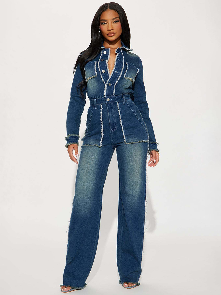 ほつれトリムデニムジャンプスーツ(レディース) - 切りっぱなしの裾、ダメージ加工、ワイドレッグ、ボディコンジーンズロンパース - 2026年春のカジュアルストリートウェア