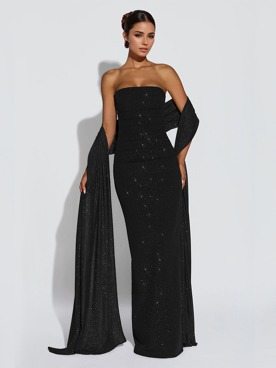 グリッターチューブマキシドレス(女性用) - セクシーな背中開きロングボディコンガウン(スカーフ付き) - 夏のイブニングフォーマル 2026