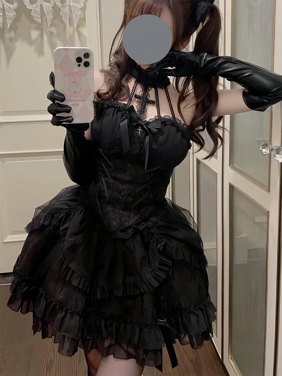 ゴシックブラックロリータドレスマルチレイヤーフリルホルターゴシックドレス