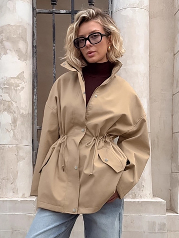 カーキ色のスタンドカラーのレディースウィンドブレーカージャケット - シックなドローストリングウエストのゆったりとしたフィット感 - 実用的なカーゴスタイル 2026年春のストリートウェア