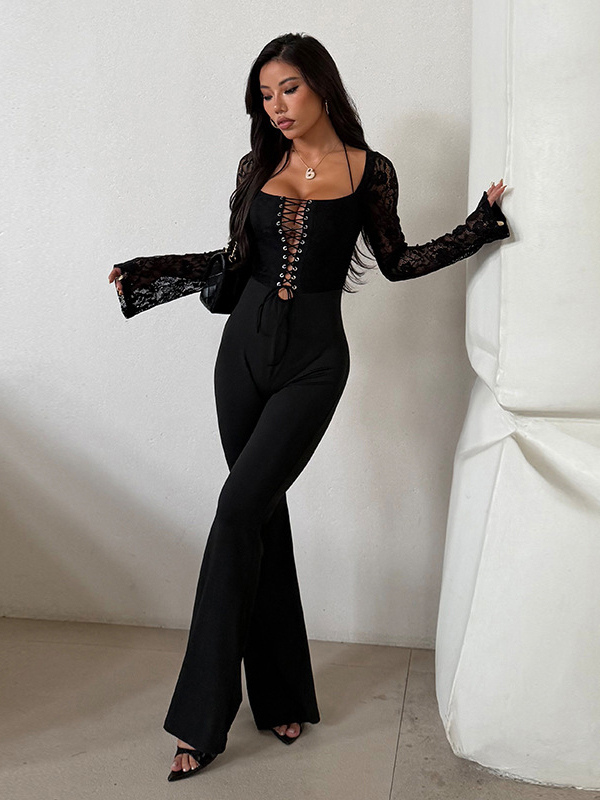 レースアップフレアジャンプスーツ(レディース) - ブラックゴシックフローラルレース長袖ボディコンロンパース - 2026年春のパーティクラブウェア