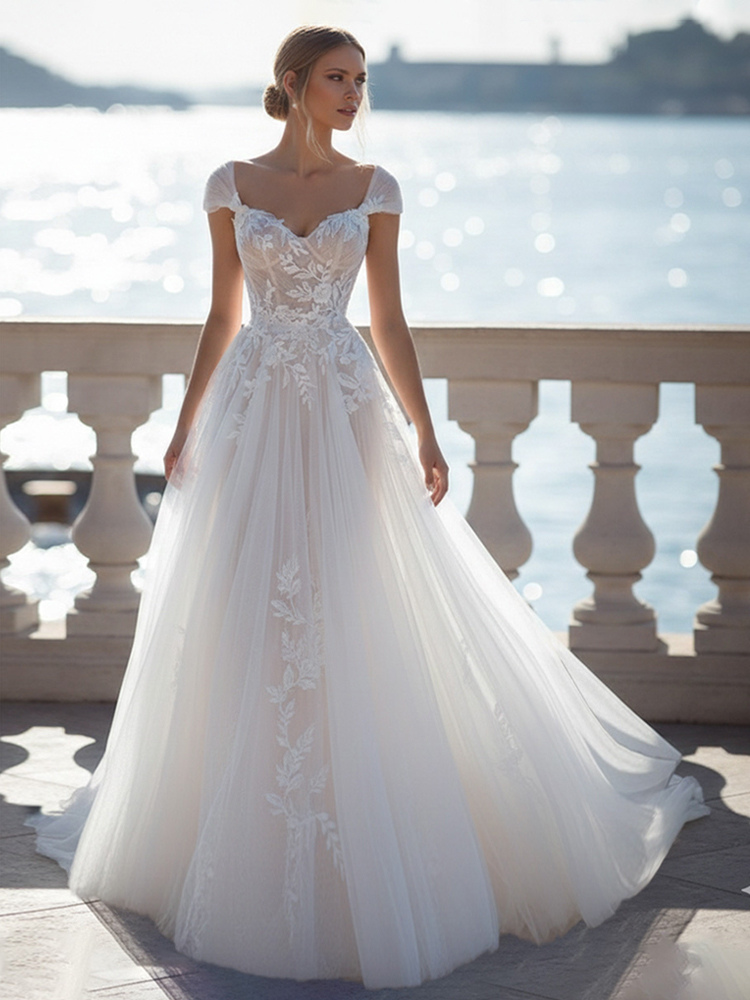 レースのウェディングドレス、トレーン付きAライン、半袖、レースのスウィートハートネック、ブライダルガウン