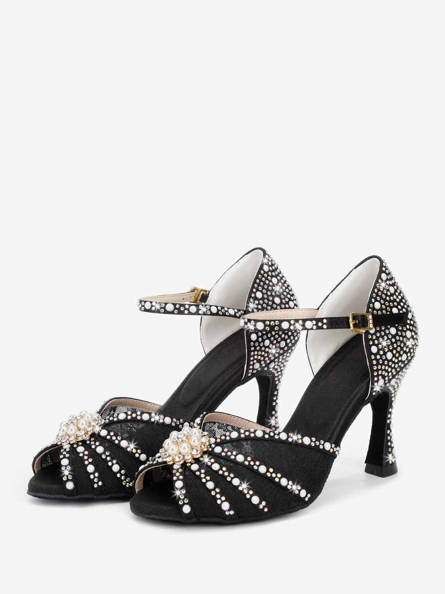 ラテンダンスシューズ サテン オープントゥ パール バックルディテール ボールルームシューズ