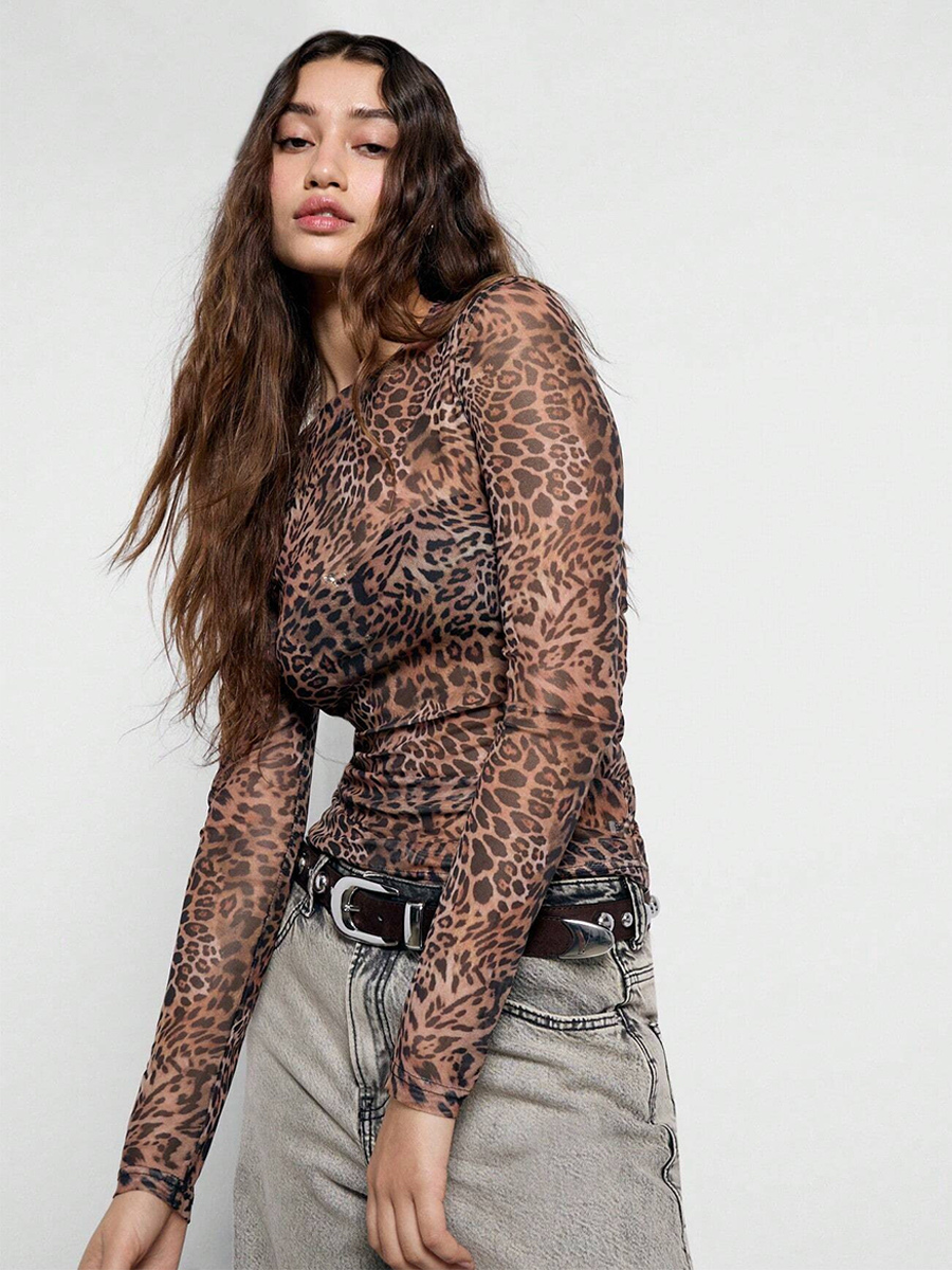 ヒョウ柄メッシュ スリムフィット 長袖 クルーネック トップス レディース 2026