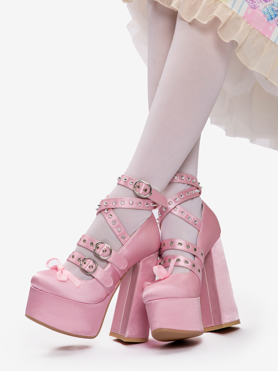 ライトピンクのロリータシューズ、Y2Kスタイルのバックルクロスストラップチャンキーヒール、サテンロリータパンプスシューズ