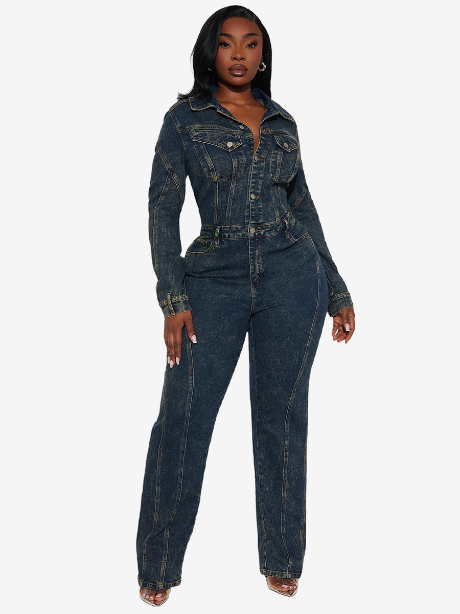 レディース長袖デニムジャンプスーツ - ダークウォッシュ ヴィンテージボタンアップ ワイドレッグ ボディコンプレイスーツ - 2026年春のストリートウェア
