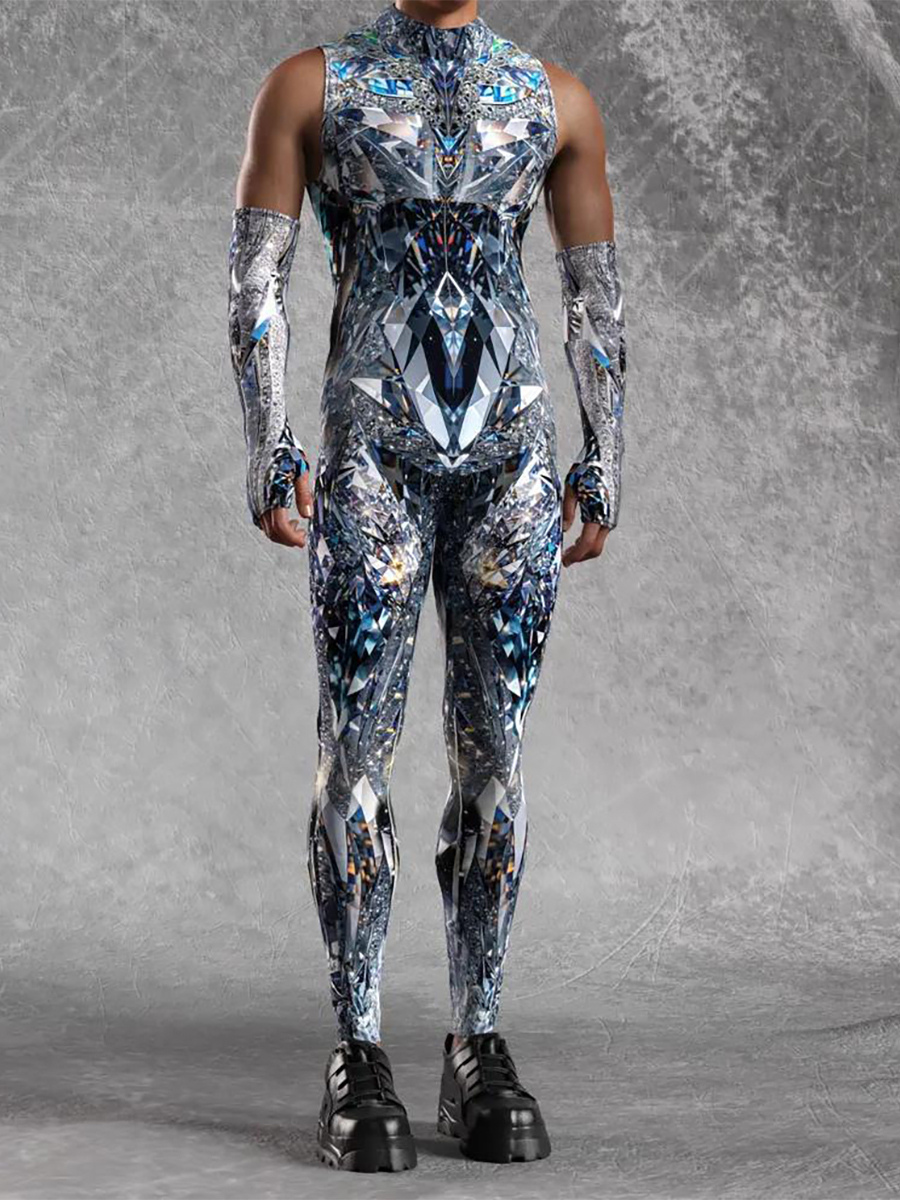 メンズ サイバーパンク ボディスーツ 錯視プリント タトゥー ジャンプスーツ