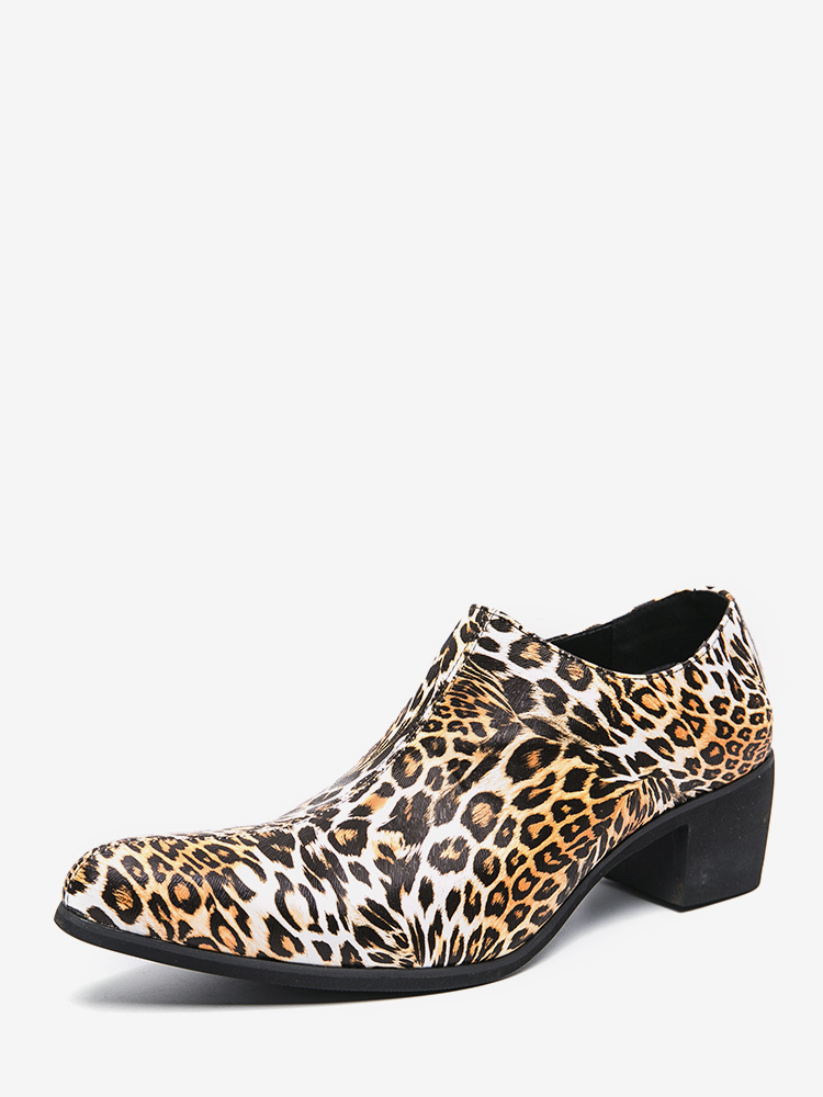 メンズドレスシューズ ポインテッドトゥ レオパード柄 チャンキーヒールシューズ