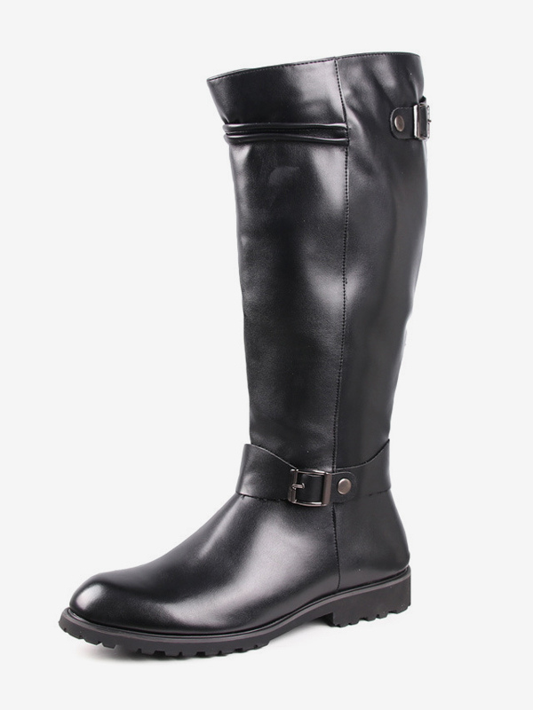 メンズ 乗馬ブーツ ブラック PU ラウンドトゥ バックルディテール ミッドカーフブーツ
