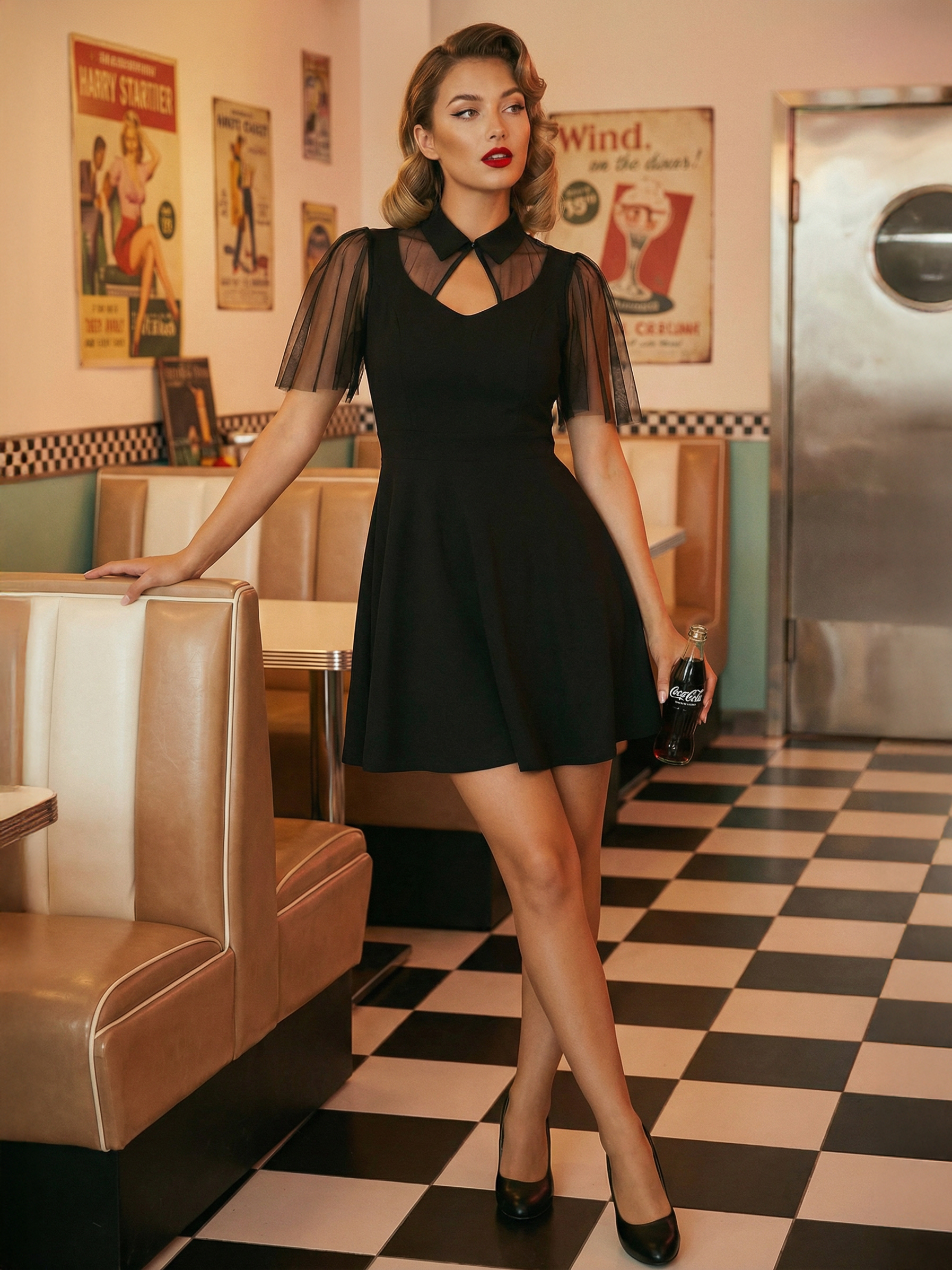 メッシュパッチワーク くり抜きネックライン Aライン スケータードレス レディース 2026