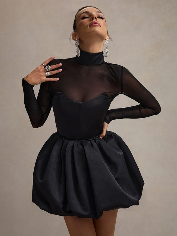 メッシュスリーブミニドレス(レディース) - ブラック エレガント モックネック パフスリーブ スケータードレス - 春のイブニングカクテルドレス 2026